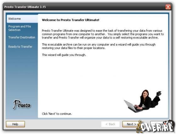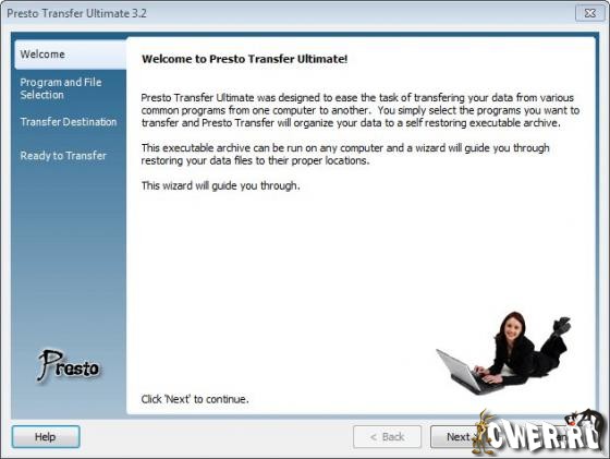Presto Transfer - приложение для передача ваших данных из одних программ в другие. После установки удобный в использовании интерфейс программы создает самораспаковывающийся архив ваших данных, для восстановления которых нужно просто запустить архив на компьютере получателя. Архив можно автоматически записать на CD/DVD, на MP3плеер через USB, на съемные носители, выложить для всеобщего доступа в сеть или переслать на удаленный FTP сервер.